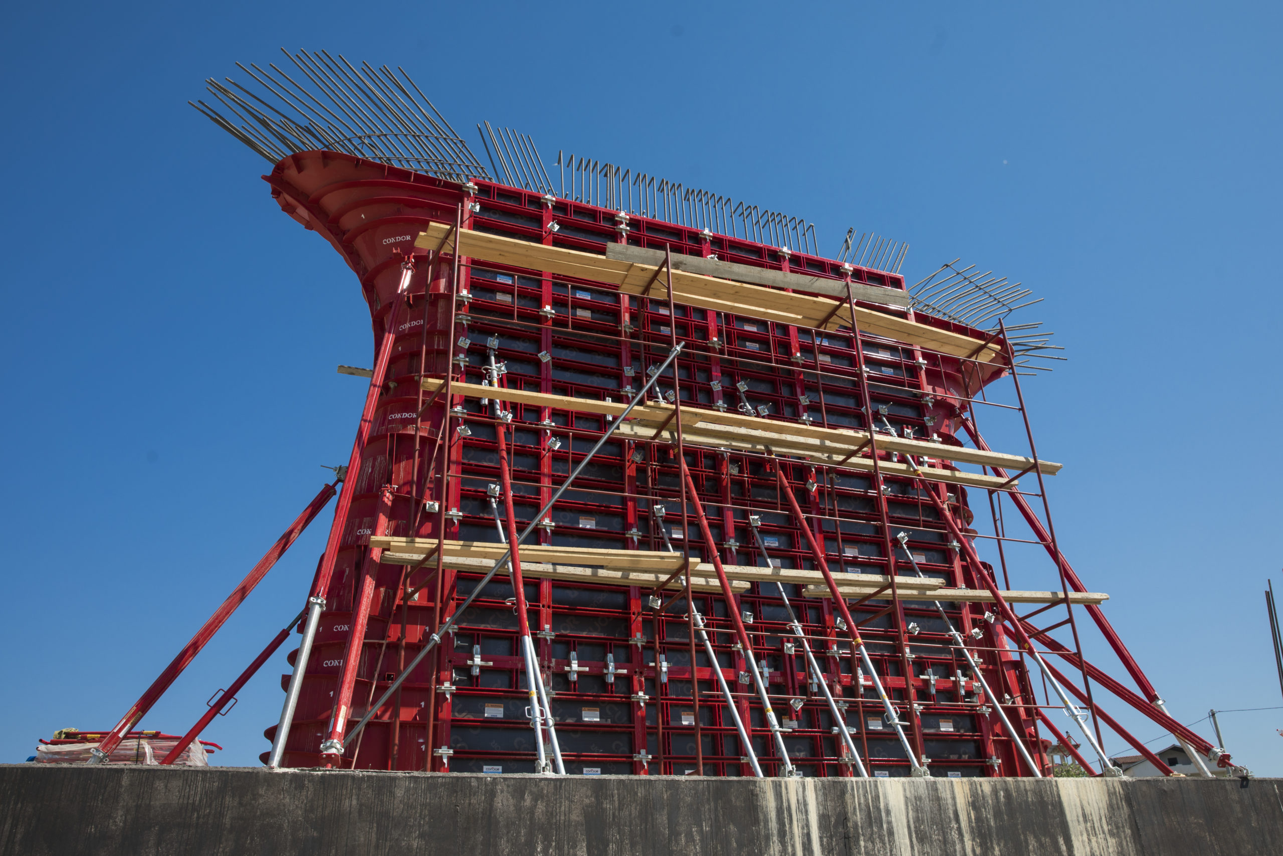 Condor nel dettaglio ha fornito il sistema Comax, capace di sopportare elevate pressioni di getto, ed i casseri speciali in acciaio per pila e pulvino a doppia curvatura.